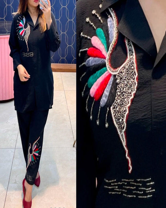 This Hand Aari Embroidery Black Co-Ord set is expertly crafted with hand embroidery using Aari...