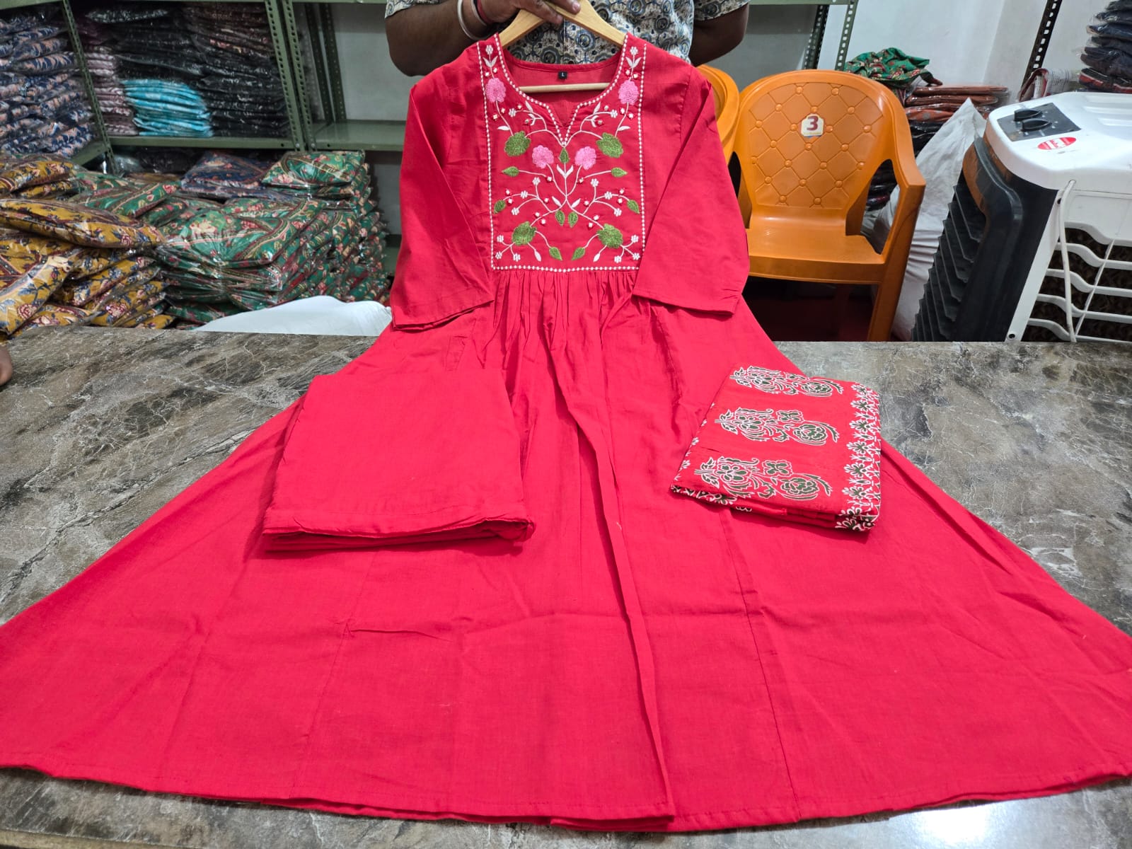 This exquisite Anarkali Kurti features intricate embroidery work that showcases traditional craftsmanship. The elegant silhouette creates a flattering drape while the accompanying flair cotton dupatta complements the ensemble perfectly. Crafted with premium materials, this versatile outfit transitions seamlessly from casual gatherings to formal occasions while ensuring comfort throughout the day.