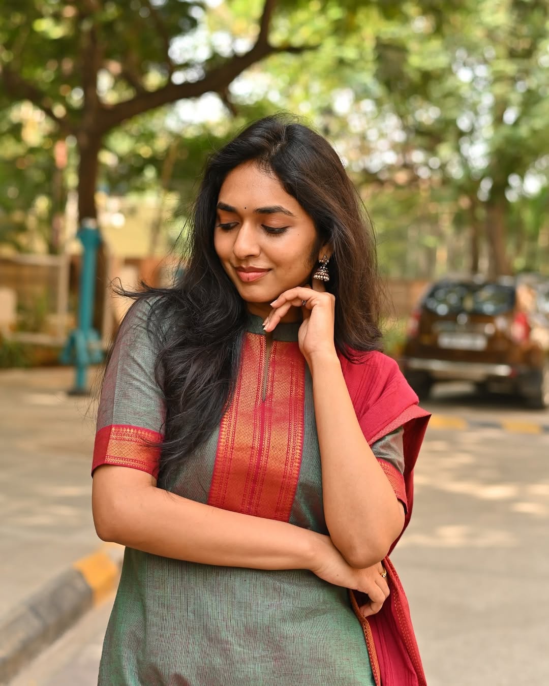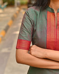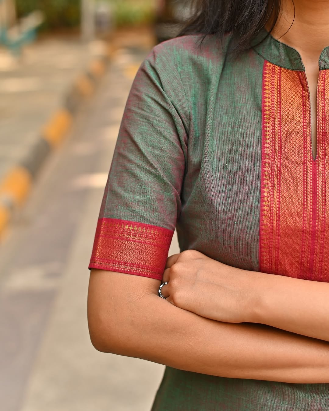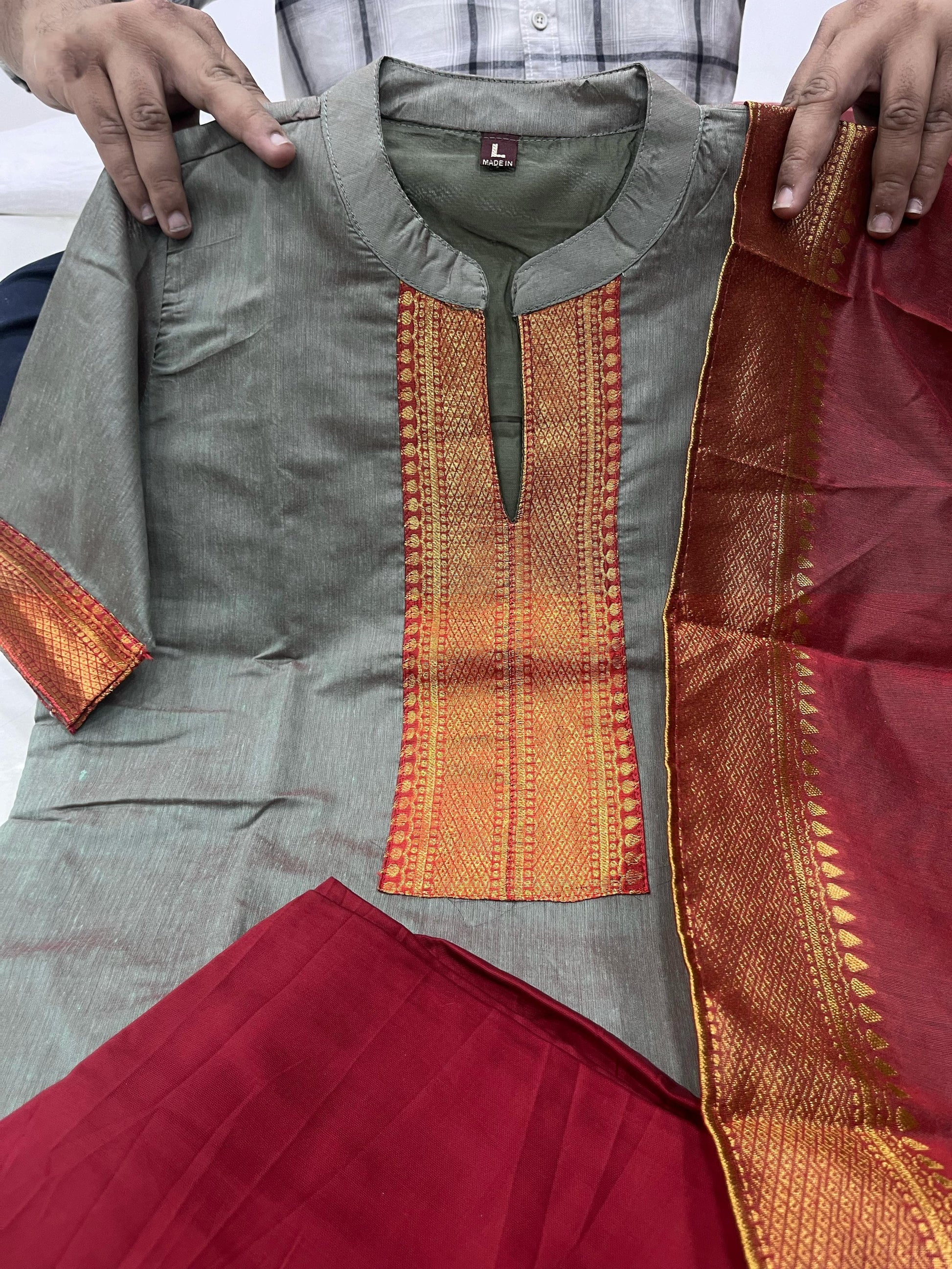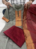 Elevate your wardrobe with our exquisite Kanchi Cotton Suit Set. Crafted from pure Kanchi cotton, this ensemble features intricate jacquard weaving and delicate hand zari work. The beautifully decorated top is complemented by matching pants and a pure jacquard dupatta with zari detailing. Perfect for special occasions and gatherings, this traditional yet contemporary set offers both comfort and sophistication.