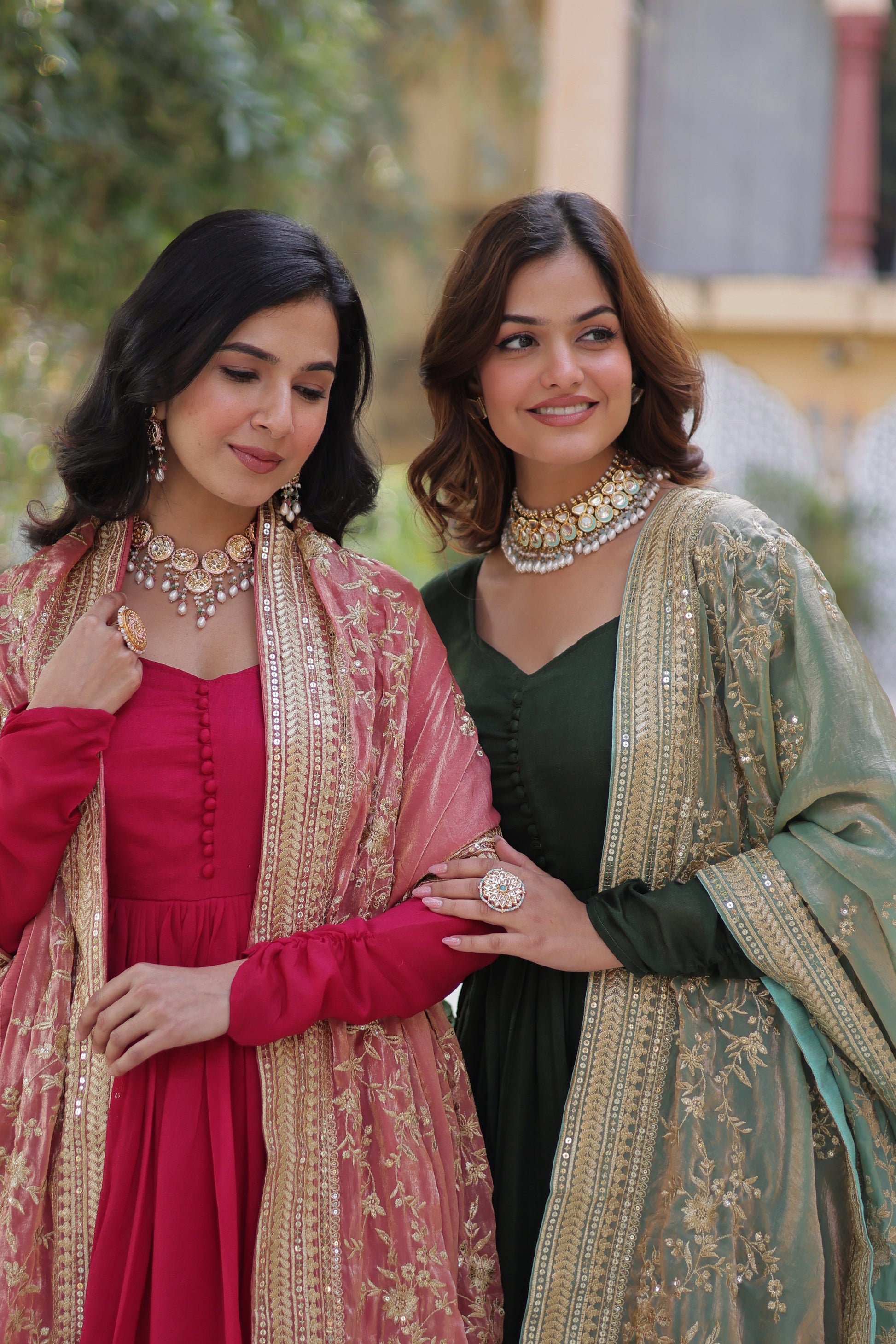 GOWN:- π FABRICS & WORK :- Shimmer Vichitra with Rich Sequins Embroidered work LENGTH :- 56 INCH FLAIR :- 3.5 MTR LINING :- Cotton (Full Inner Top To Bottom) SLEEVES:- Full Sleeves NECK TYPE :- Fancy V-Neck STITCHING TYPE:- Stitched with Canvas Patta DUPATTA:- π FABRIC & WORK:- Fendi with Sequins and Embroidered work and designer lace border. LENGTH :- 2.3 MTR PACKAGE CONTAIN: - 1-Gown,1-Dupatta