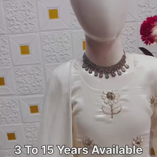 Make your little one shine with this elegant White Embroidered Anarkali Gown with Dupatta. Designed with delicate floral embroidery and a graceful flare, this outfit gives a royal ethnic look while keeping comfort in mind. The soft fabric ensures easy movement, and the matching dupatta adds a touch of traditional charm. Perfect for festivals, weddings, birthdays, functions, and special occasions, this outfit is a must-have for your child’s festive wardrobe.