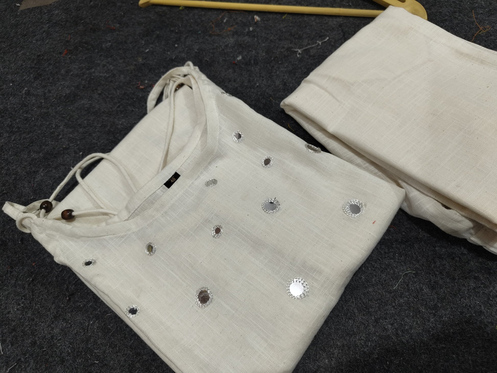 Elevate your summer wardrobe with our Beautiful Slub Cotton Cord Set. This sleeveless kurta features exquisite mirror work detailing across three stunning color options. The premium slub cotton fabric ensures breathability and comfort during hot weather, while the elegant design creates a sophisticated silhouette. Perfect for those seeking both comfort and style in their seasonal attire.