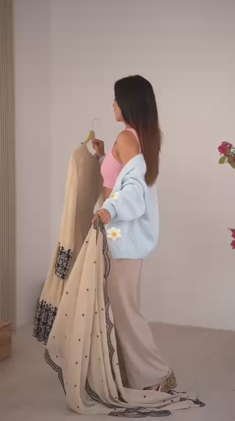 Step into timeless elegance with this stunning Beige Anarkali Suit featuring intricate black embroidery detailing. Designed with a graceful V-neckline and full sleeves, this floor-length Anarkali showcases beautiful black embroidered borders on the hem and sleeves, adding a luxurious traditional touch.