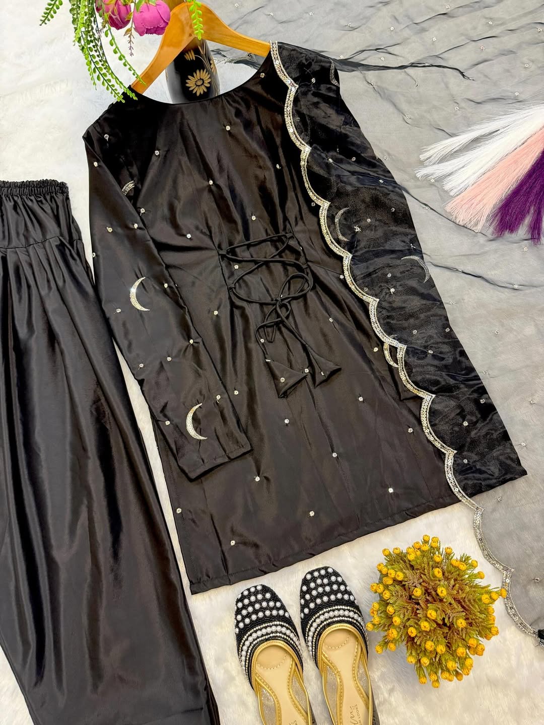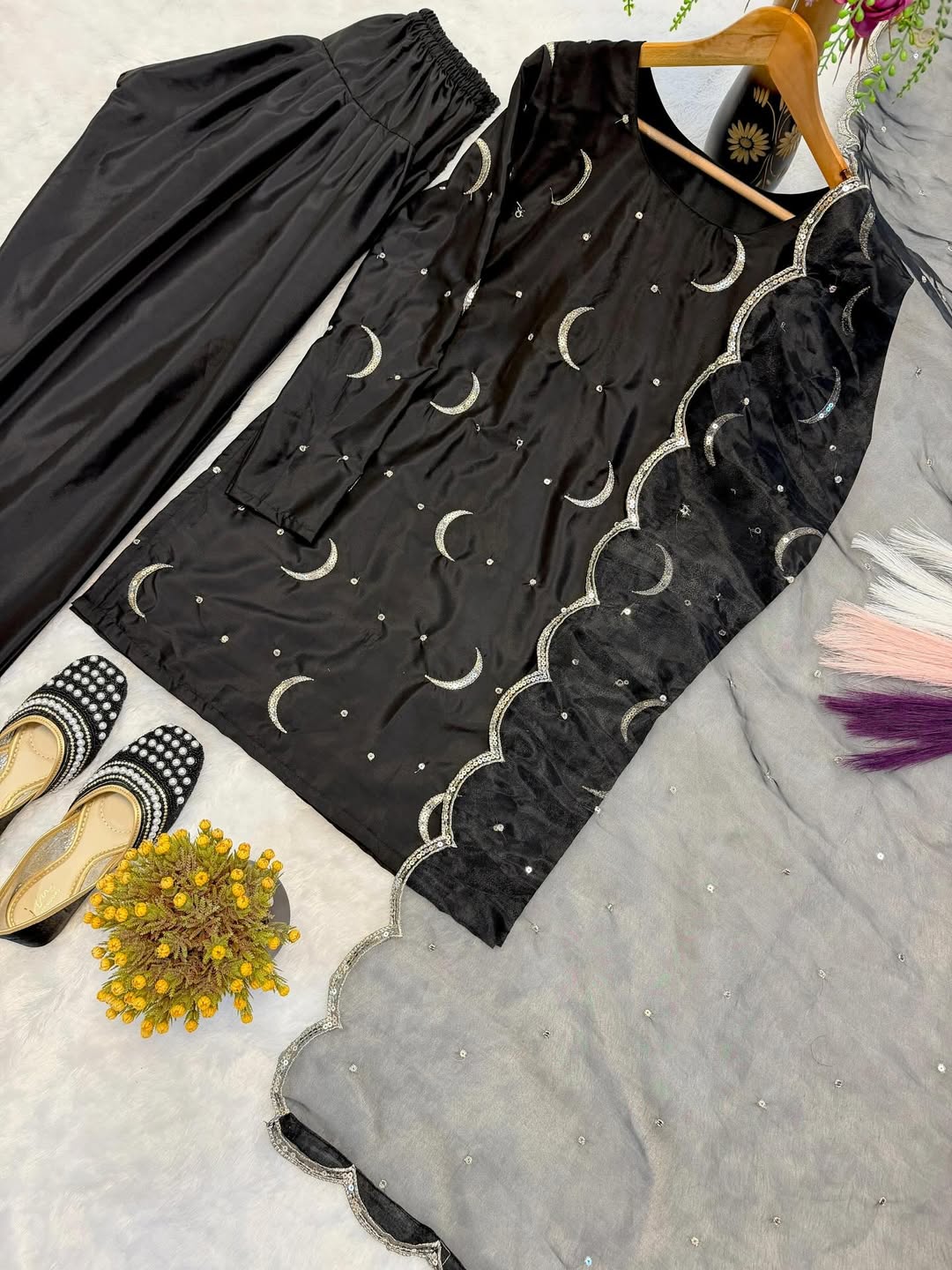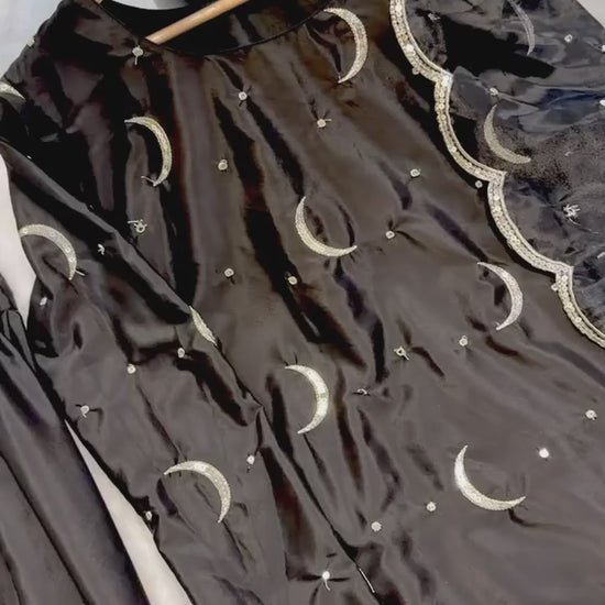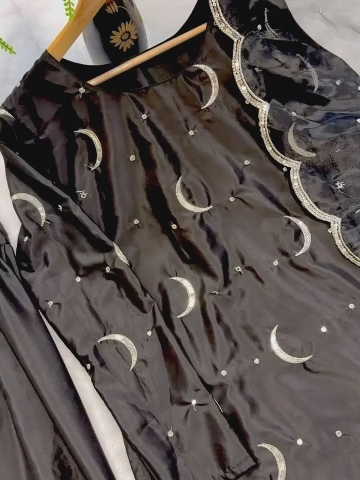 Make a bold and elegant statement with this black designer kurta sharara set, crafted for modern festive and party wear looks. The kurta is beautifully adorned with unique moon motif embroidery and delicate sequin work, giving it a classy and contemporary touch.