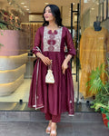 Cotton anarkali kurta set with embroidery and printed mulmul dupatta