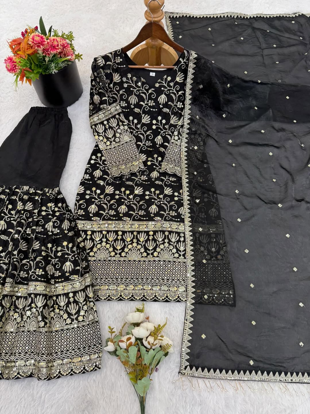 Upgrade your ethnic collection with this Designer Embroidered Salwar Suit Set, crafted with elegant thread embroidery and sequin detailing. The beautifully designed kurta features intricate floral motifs and rich borders, paired with a matching pleated salwar and a soft net dupatta highlighted with fine embroidery and scalloped lace edging.