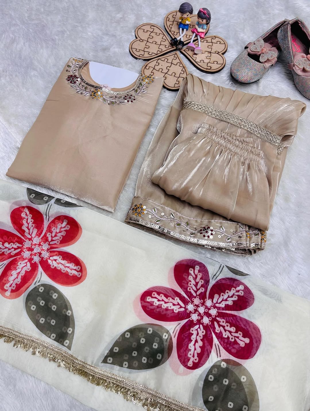 Step into elegance with this beautiful Beige Sharara Suit Set, designed for festive and special occasions. The outfit features a classy straight-cut kurta with delicate embroidery on the neckline and borders, paired with a flowy sharara that adds grace to every step. The look is completed with a soft, lightweight dupatta adorned with stylish floral and leaf prints and a subtle lace border.