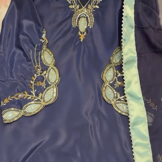 Elevate your ethnic style with this stunning navy blue kurti pant set, beautifully designed with intricate embroidery and elegant detailing. The kurti features rich thread embroidery on the neckline, sleeves, and hem, enhanced with delicate mirror-style accents for a classy designer look. Paired with a comfortable matching pant and a soft contrast dupatta with satin border, this outfit is ideal for festive occasions, parties, evening functions, and special gatherings. A perfect blend of grace, comfort, and modern ethnic charm.
