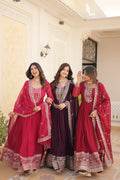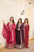 Maroon Faux Blooming Gown With Embroidered Dupatta
