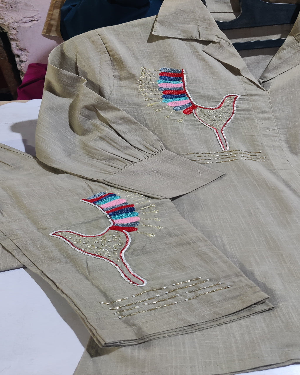 Expertly crafted with hand Aari embroidery, this gray co-ord set exudes elegance and sophistication. Each piece showcases intricate stitching, creating a unique and luxurious look. Elevate your wardrobe with this one-of-a-kind set that is sure to turn heads and make a statement. Perfect for any occasion, this set is a must-have for any fashion-forward individual.