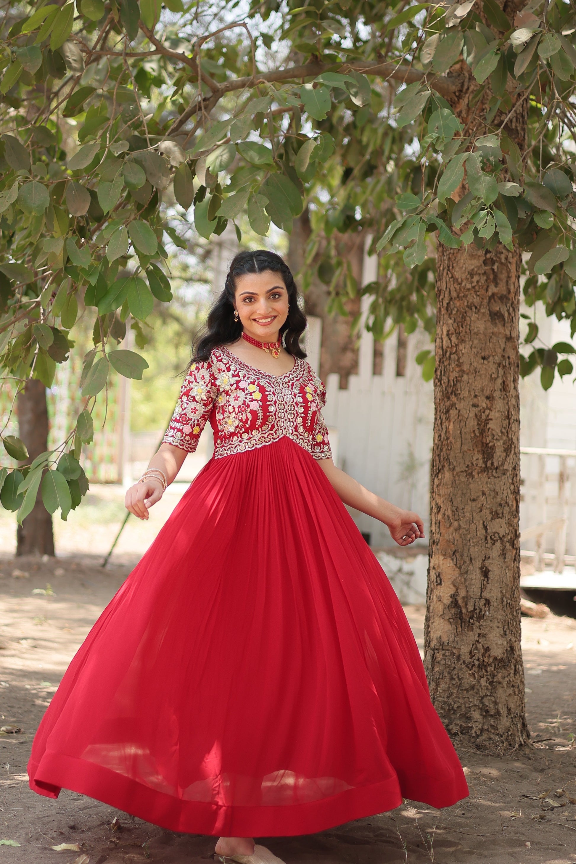 ππ» GOWN :- π ππ» FABRIC & WORK:- Faux Blooming with Embroidery Zari Sequins-work ππ» LENGTH:- 55INCH ππ» FLAIR: - 3.5 MTR ππ» LINING:- Cotton (Full Inner Top To Bottom) ππ» SLEEVE:- Half Sleeves ππ» NECK TYPE:- Fancy V Neck ππ» PACKAGE CONTAIN:- Gown