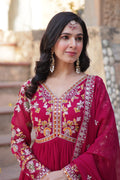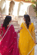 Experience luxury with our Premium Designer Flare Gown. Made with faux blooming fabric and adorned with intricate embroidery, zari, and sequin work, our gown exudes elegance and sophistication. The readymade design also comes with a matching dupatta for a complete and effortless look. Elevate your style and make a statement with our gown.