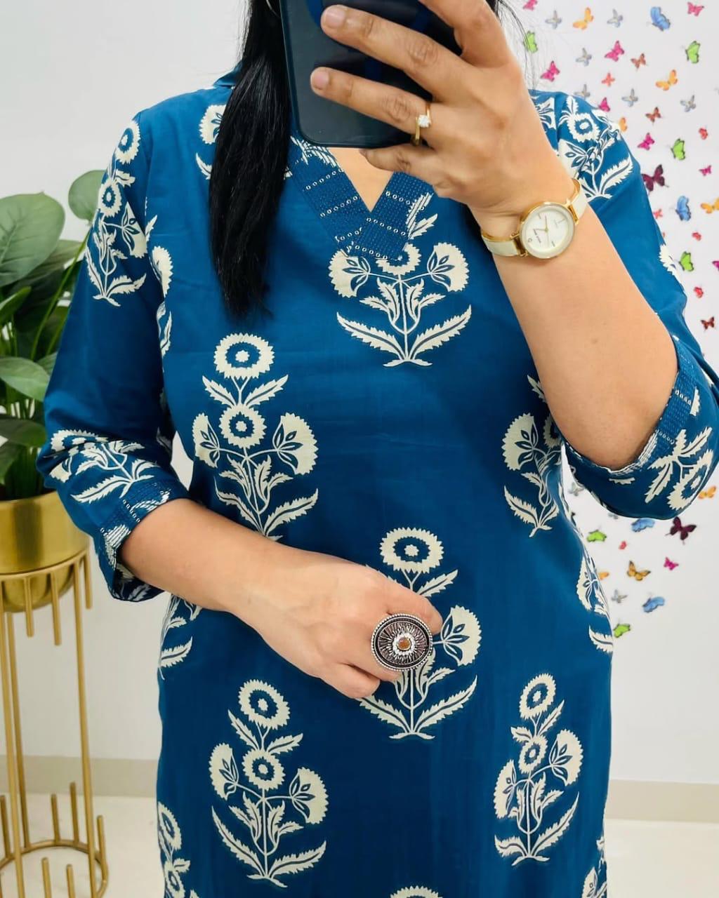 Royal Blue Floral Kurta Pant and Dupatta Set