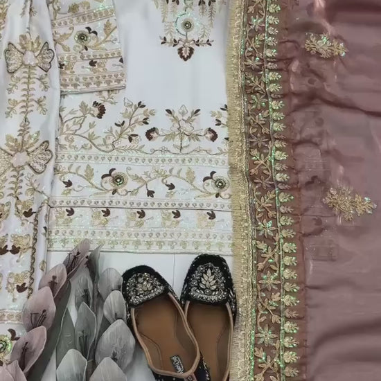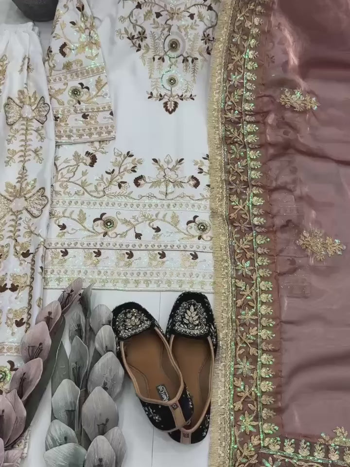 Add timeless elegance to your ethnic collection with this luxurious white designer suit set, crafted in heavy natural silk and highlighted with rich golden embroidery. The beautifully embroidered kurta features intricate floral and traditional motifs, paired with a matching bottom and a contrasting peach embroidered dupatta that adds a royal touch.