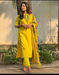 Women Cotton Slub Yellow Kurta Pant and Madhubani Print Dupatta set
