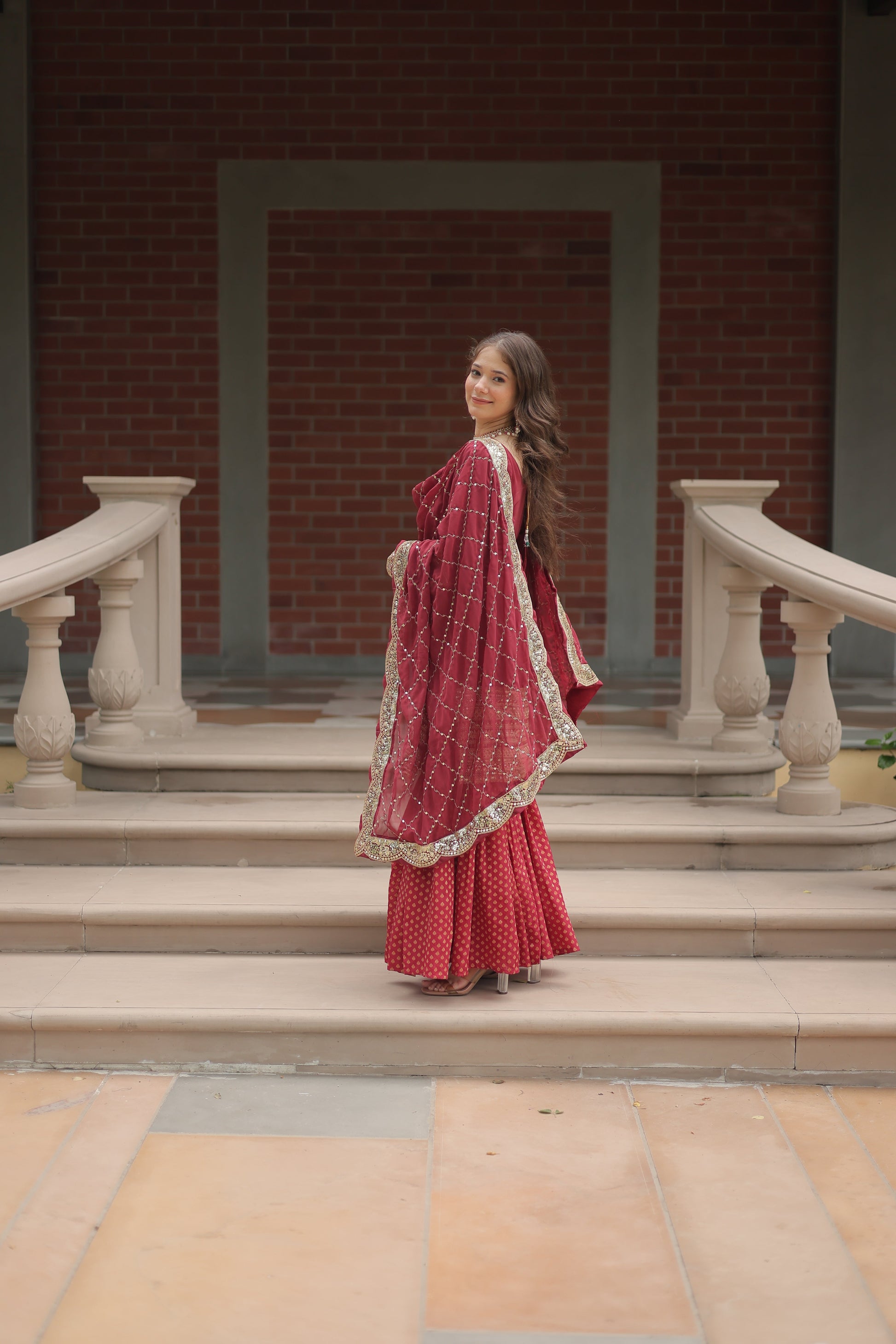 | Kurti: Fabric & Work: Faux Georgette with sequins and thread embroidered work, which adds a touch of shimmer and texture, making it look elegant and festive. Sleeves: Full sleeves, matching the photo, adding a classic touch of sophistication. Length: 34 inches, giving it a mid-length, modern kurti look. Lining: Full cotton inner lining for comfort and to ensure a smooth fit. Neck: Designer square neck, which gives a unique, flattering look. Stitching: Standard stitching, offering durability and comfort. Sharara: Fabric & Work: Dayble Viscose Jacquard, a smooth, rich fabric that complements the kurti beautifully. Length: 42 inches, a perfect length for a sharara that provides volume and flow. Lining: Full cotton inner lining for comfort and opacity. Stitching: Elastic waist with standard stitching, making it easy to wear and comfortable. Dupatta: Fabric & Work: Faux Georgette with sequins embroidered arco cutwork and lace border, adding a delicate and luxurious touch to the set. Length: 2.30 meters, giving plenty of length for draping |